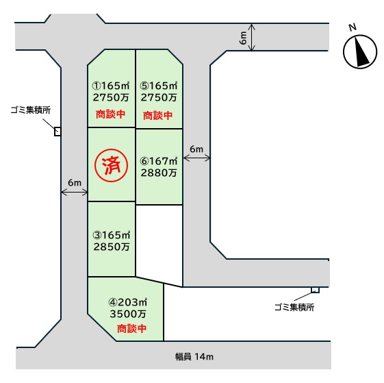 | 接道 | 北側6m 西側6m 公道 ※①区画 |