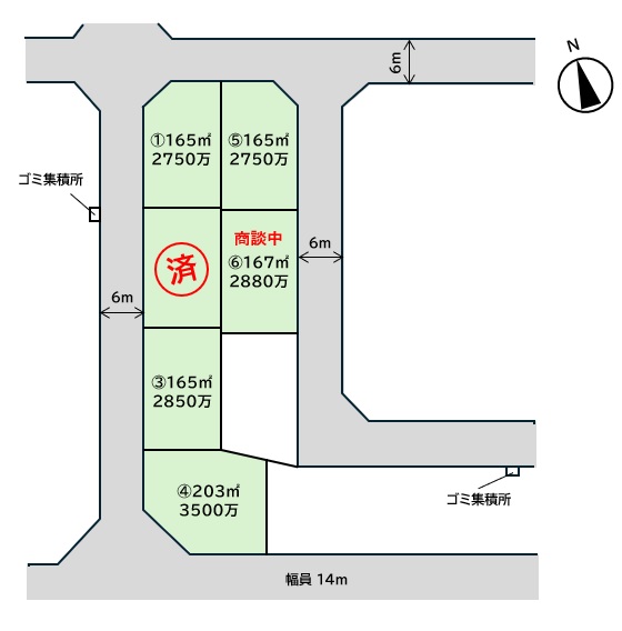 接道 | 北側6m・西側6m 公道 ※①区画 |